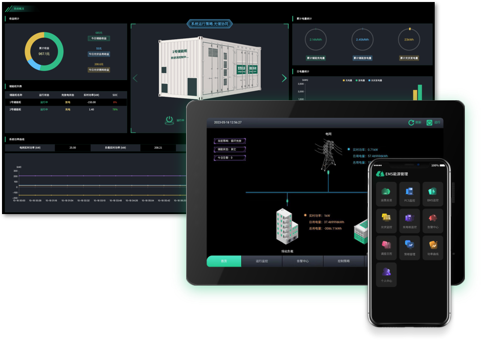 EMS系統(tǒng)從整個場站的視角展示源網(wǎng)荷儲能量流轉(zhuǎn)的實(shí)時情況,并聚合統(tǒng)計電網(wǎng)、負(fù)載、儲能、光伏以及充電樁等節(jié)點(diǎn)的實(shí)時功率和電量數(shù)據(jù)。該系統(tǒng)還支持顯示當(dāng)前場站的運(yùn)行策略、儲能電池的狀態(tài)以及系統(tǒng)的一次接線圖等信息。