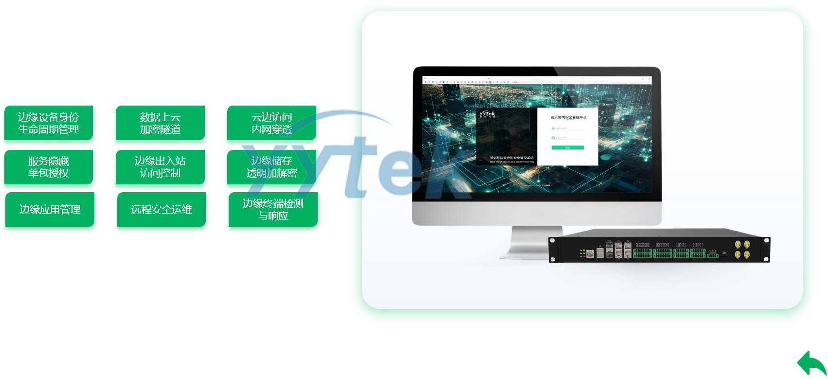 系統(tǒng)基于零信任理念,采用SDP軟件定義邊界網(wǎng)絡(luò)安全架構(gòu),為基于云、邊、端三級分層模型的物聯(lián)網(wǎng)系統(tǒng),提供增強(qiáng)身份認(rèn)證和授權(quán)、設(shè)備接入安全、網(wǎng)絡(luò)訪問與傳輸安全、數(shù)據(jù)存儲安全、安全應(yīng)用倉庫、安全運(yùn)維等多維度防護(hù)。