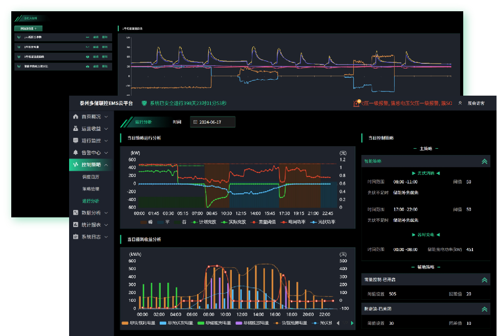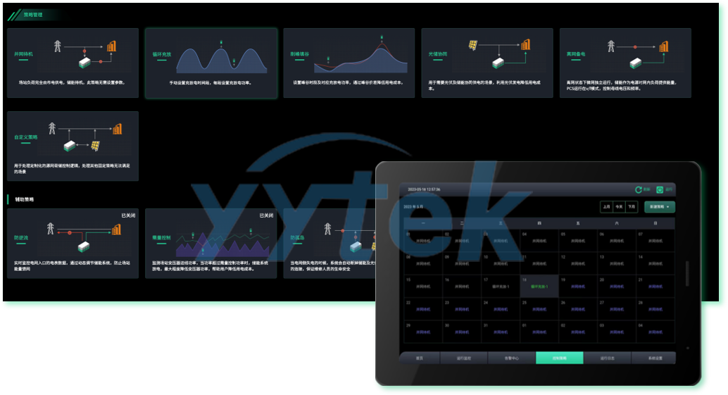 EMS系統(tǒng)支持全面的場站能源控制策略,包括并網(wǎng)待機(jī)、循環(huán)充放、削峰填谷、光儲協(xié)同、離網(wǎng)備電、自定義策略、防逆流、防孤島運(yùn)行、以及需量控制等。場站可以根據(jù)自身需求、當(dāng)?shù)仉妰r策略以及實(shí)際生產(chǎn)用電情況,按天設(shè)置相應(yīng)的控制策略。同時,系統(tǒng)支持連接云涌VPP運(yùn)營管理系統(tǒng),接收虛擬電廠平臺下發(fā)的需求響應(yīng)策略并執(zhí)行。