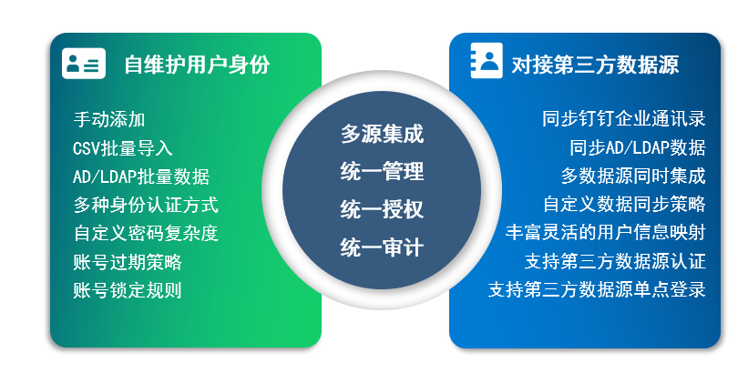 云涌零信任安全管理平臺(tái)既支持主流企業(yè)通訊錄系統(tǒng)的數(shù)據(jù)導(dǎo)入與同步,也支持自建用戶(hù)體系。實(shí)現(xiàn)了在一個(gè)平臺(tái)對(duì)企業(yè)人員、部門(mén)以及角色組的統(tǒng)一高效管理。同時(shí)系統(tǒng)提供多種用戶(hù)認(rèn)證方式,全方位滿(mǎn)足各種需求場(chǎng)景。