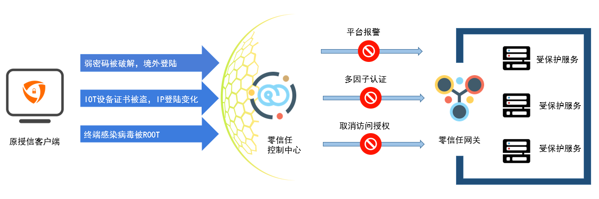 云涌零信任持續(xù)偵測(cè)終端運(yùn)行環(huán)境,包括操作系統(tǒng)環(huán)境及網(wǎng)絡(luò)環(huán)境等。系統(tǒng)針對(duì)終端運(yùn)行環(huán)境變化,依據(jù)安全基線(xiàn)策略及登錄認(rèn)證策略等,實(shí)時(shí)響應(yīng)并觸發(fā)不同級(jí)別的措施如MFA、告警或立即阻斷等。