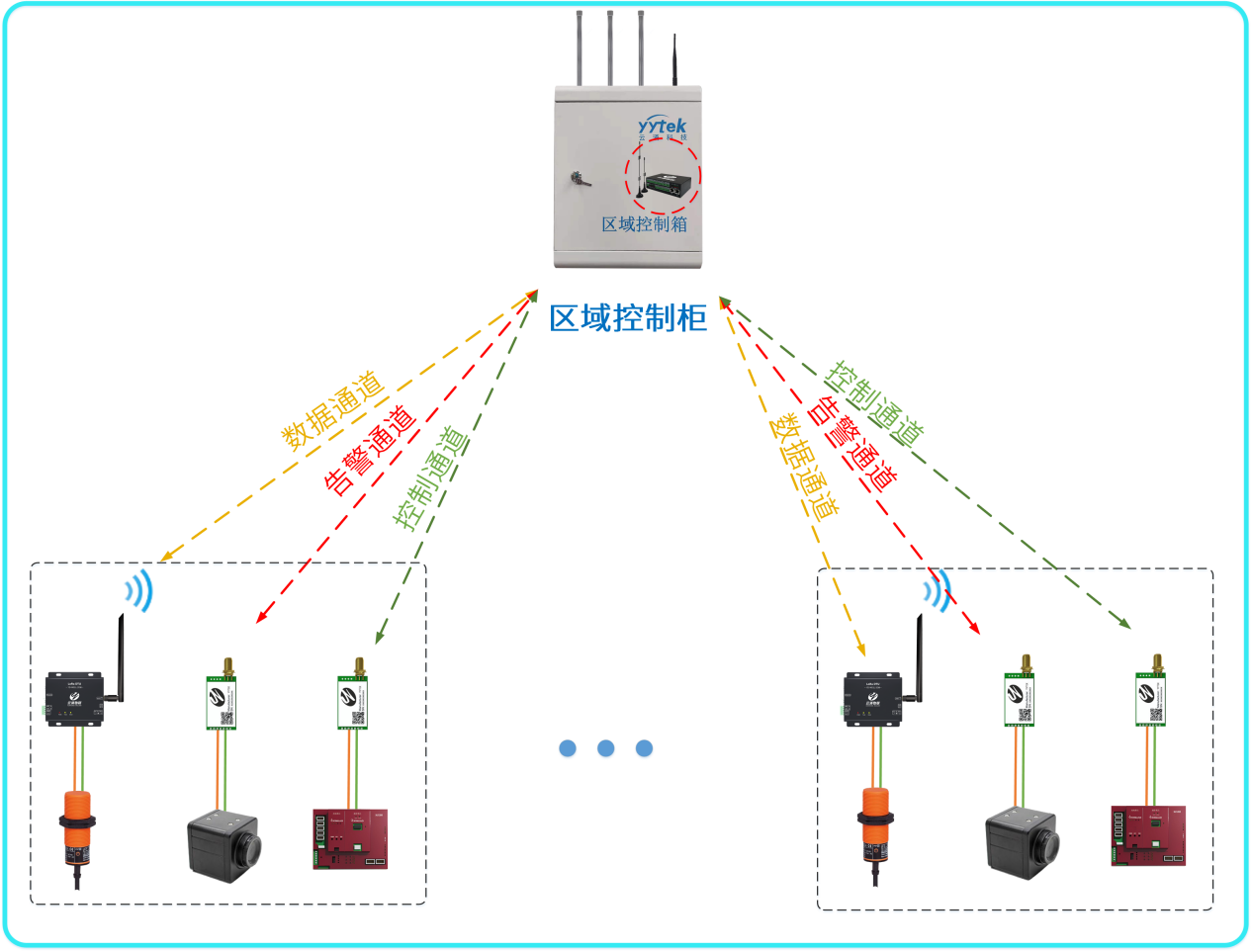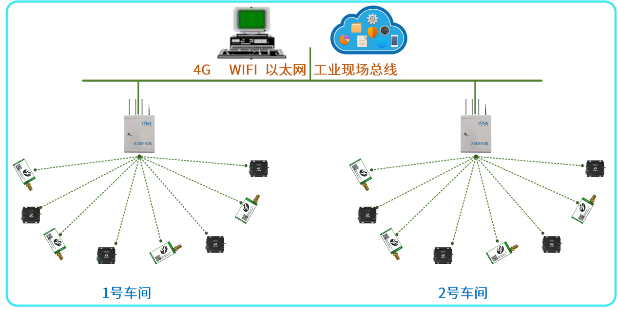 一個廠區(qū)可以配備多個區(qū)域控制箱,每個控制箱最多配備500-2000個設備節(jié)點,每個區(qū)域柜都能與工業(yè)系統(tǒng)進行對接,也可相互通訊;