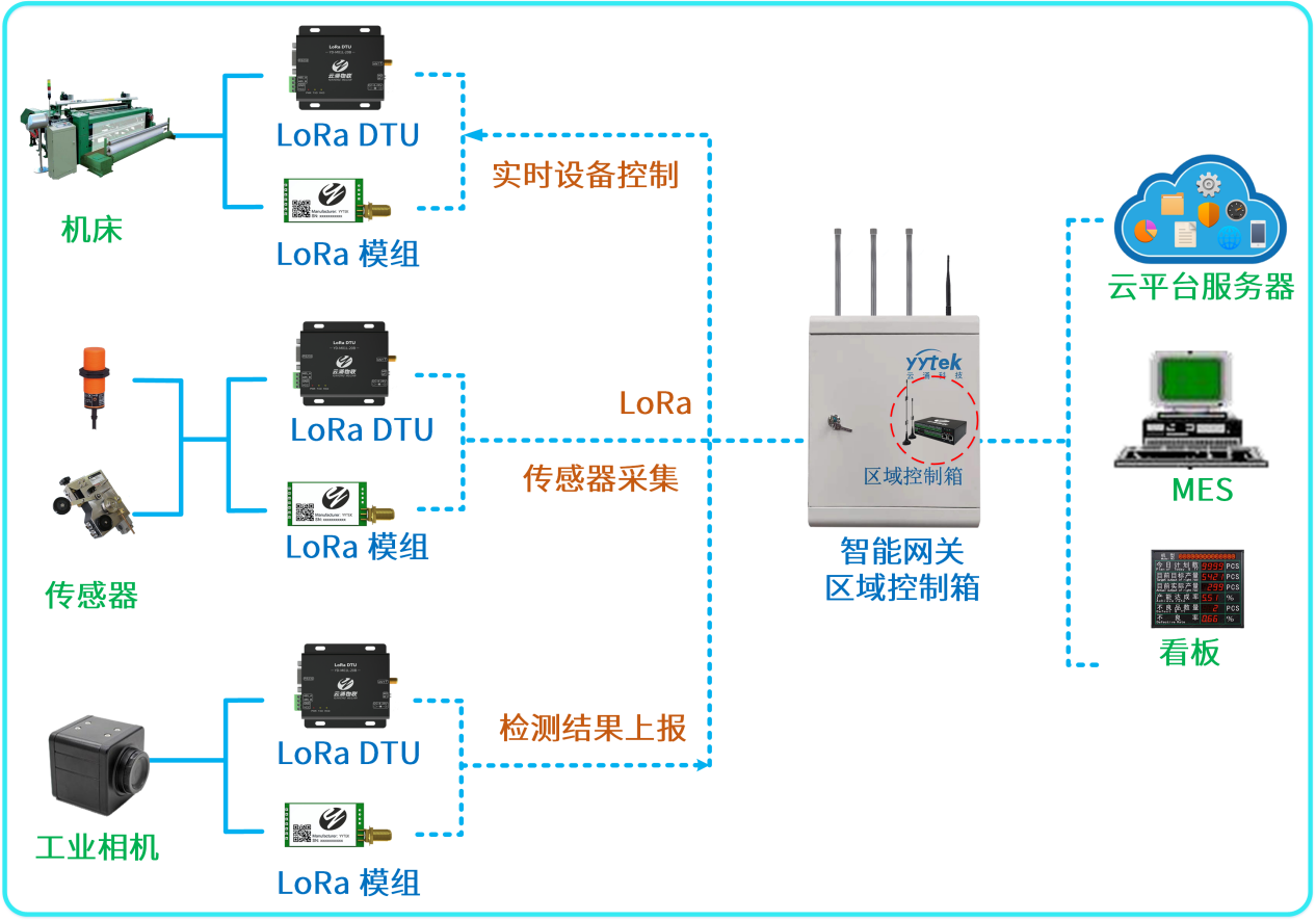 在工廠內(nèi)的各個終端節(jié)點(傳感器、工業(yè)設備、工業(yè)相機)使用LORA DTU和LORA模組升級設備和傳感器,使設備具備無線傳輸能力,實現(xiàn)對生產(chǎn)數(shù)據(jù)的實時上報和操作指令接收。通過云涌智能無線網(wǎng)關(guān)對著這些終端節(jié)點進行數(shù)據(jù)的采集和接收,再由網(wǎng)關(guān)進行數(shù)據(jù)分析和協(xié)議轉(zhuǎn)換,與上層的不同業(yè)務系統(tǒng)進行數(shù)據(jù)的交互。