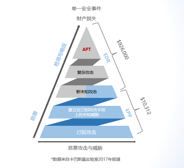 傳統(tǒng)的端點安全防護(hù)主要是靠殺毒軟件,通過病毒特征碼匹配進(jìn)行本地查殺,屬于單機被動防御產(chǎn)品。之后的EPP(端點保護(hù)平臺)雖然作為平臺級端點主動防御解決方案并在企業(yè)廣泛應(yīng)用,但該產(chǎn)品還是采用了防御型技術(shù),難以應(yīng)對復(fù)雜攻擊和高級威脅。隨著終端泛在化,未來所有的網(wǎng)絡(luò)節(jié)點都將是終端,端點安全的關(guān)注點,已經(jīng)從單一安全防御轉(zhuǎn)移到更注重威脅發(fā)現(xiàn)和自動化處置能力,對自動化威脅檢測、響應(yīng)、處理、運維能力要求越來越高。在此基礎(chǔ)上,EDR應(yīng)運而生。
