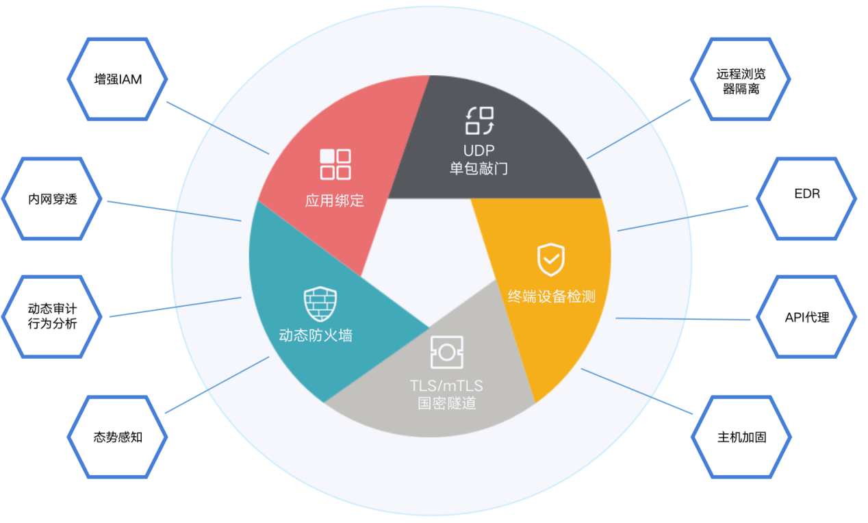 ? ? ? 零信任網(wǎng)絡(luò)訪問平臺(tái)融合了當(dāng)前最新的安全技術(shù),通過聯(lián)動(dòng)的安全矩陣設(shè)計(jì),形成一個(gè)整體的安全閉環(huán)。安全矩陣主要包括:SDP安全框架,遠(yuǎn)程瀏覽器隔離,增強(qiáng)IAM, 內(nèi)網(wǎng)穿透,動(dòng)態(tài)審計(jì)與行為分析,態(tài)勢(shì)感知,端點(diǎn)檢測(cè)與響應(yīng)EDR,主機(jī)加固,API代理等。