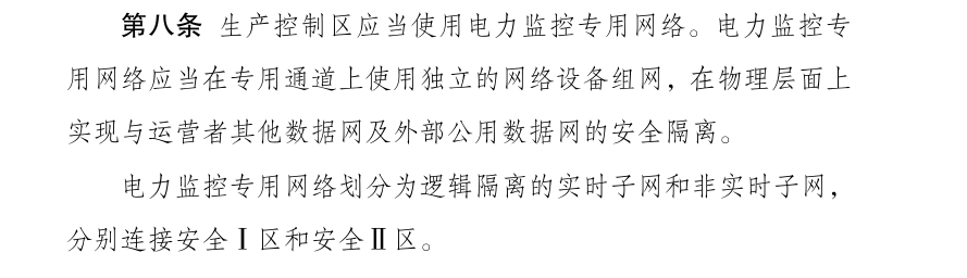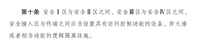 ? ? ? ? 其中第八條和第十條首次提出了邏輯隔離的概念,提到生產(chǎn)控制區(qū)應(yīng)當(dāng)使用電力監(jiān)控專用網(wǎng)絡(luò),劃分為邏輯隔離的實(shí)時(shí)子網(wǎng)和非實(shí)時(shí)子網(wǎng),分別連接安全Ⅰ區(qū)和安全Ⅱ區(qū);安全Ⅰ區(qū)與安全Ⅱ區(qū)之間、安全Ⅲ區(qū)與安全Ⅳ區(qū)之間、安全接入?yún)^(qū)與終端之間應(yīng)當(dāng)設(shè)置具有訪問控制功能的設(shè)備、防火墻或者相當(dāng)功能的邏輯隔離設(shè)施。