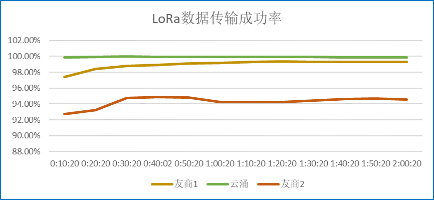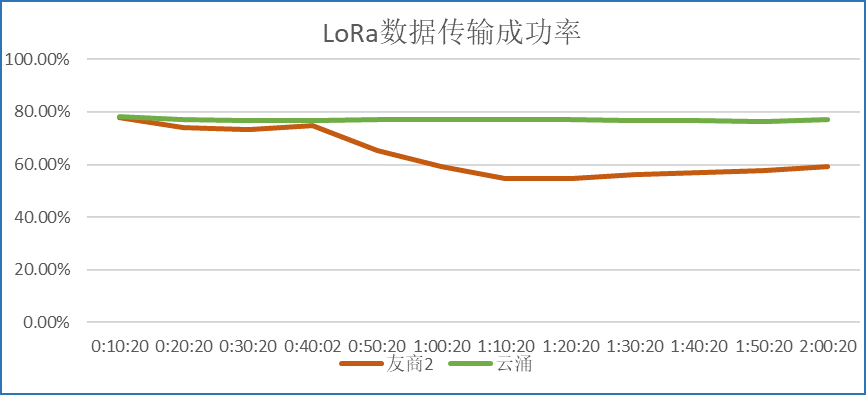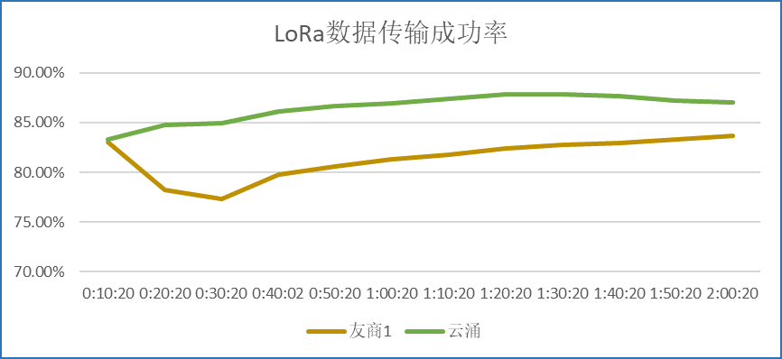 ? ? ? 在測試環(huán)境穩(wěn)定且一致的條件下,通過同樣的連接方式,對比云涌LORA數傳電臺和另外兩家友商設備的測試結果,可以得出:云涌科技的LoRa DTU擁有更好的抗干擾能力,而且在同頻干擾的情況下,傳輸的成功率更高,傳輸的穩(wěn)定性更好。