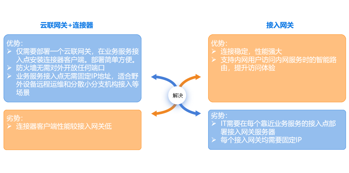 云涌零信任支持兩種內(nèi)網(wǎng)訪問模式:基于接入網(wǎng)關(guān)的訪問代理,以及基于云聯(lián)網(wǎng)關(guān)+連接器的內(nèi)網(wǎng)穿透??蛻艨梢愿鶕?jù)自身IT架構(gòu)及實(shí)際需求選擇適合的服務(wù)訪問模式。兩種模式可以同時(shí)存在。