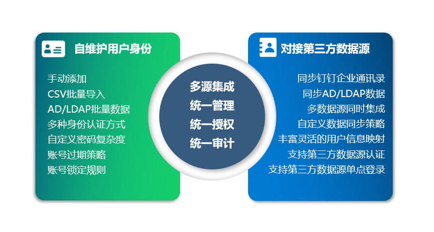 云涌零信任安全管理平臺既支持主流企業(yè)通訊錄系統(tǒng)的數(shù)據(jù)導(dǎo)入與同步,也支持自建用戶體系。實(shí)現(xiàn)了在一個(gè)平臺對企業(yè)人員、部門以及角色組的統(tǒng)一高效管理。同時(shí)系統(tǒng)提供多種用戶認(rèn)證方式,全方位滿足各種需求場景。