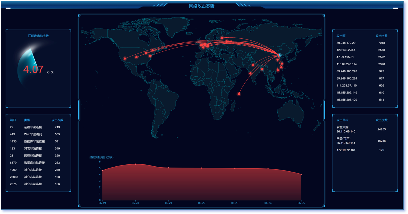 ?云涌提供了基于零信任系統(tǒng)的網(wǎng)絡(luò)攻擊態(tài)勢感知,管理端大屏展示從攻擊源到攻擊目標(biāo)的實(shí)時(shí)態(tài)勢;